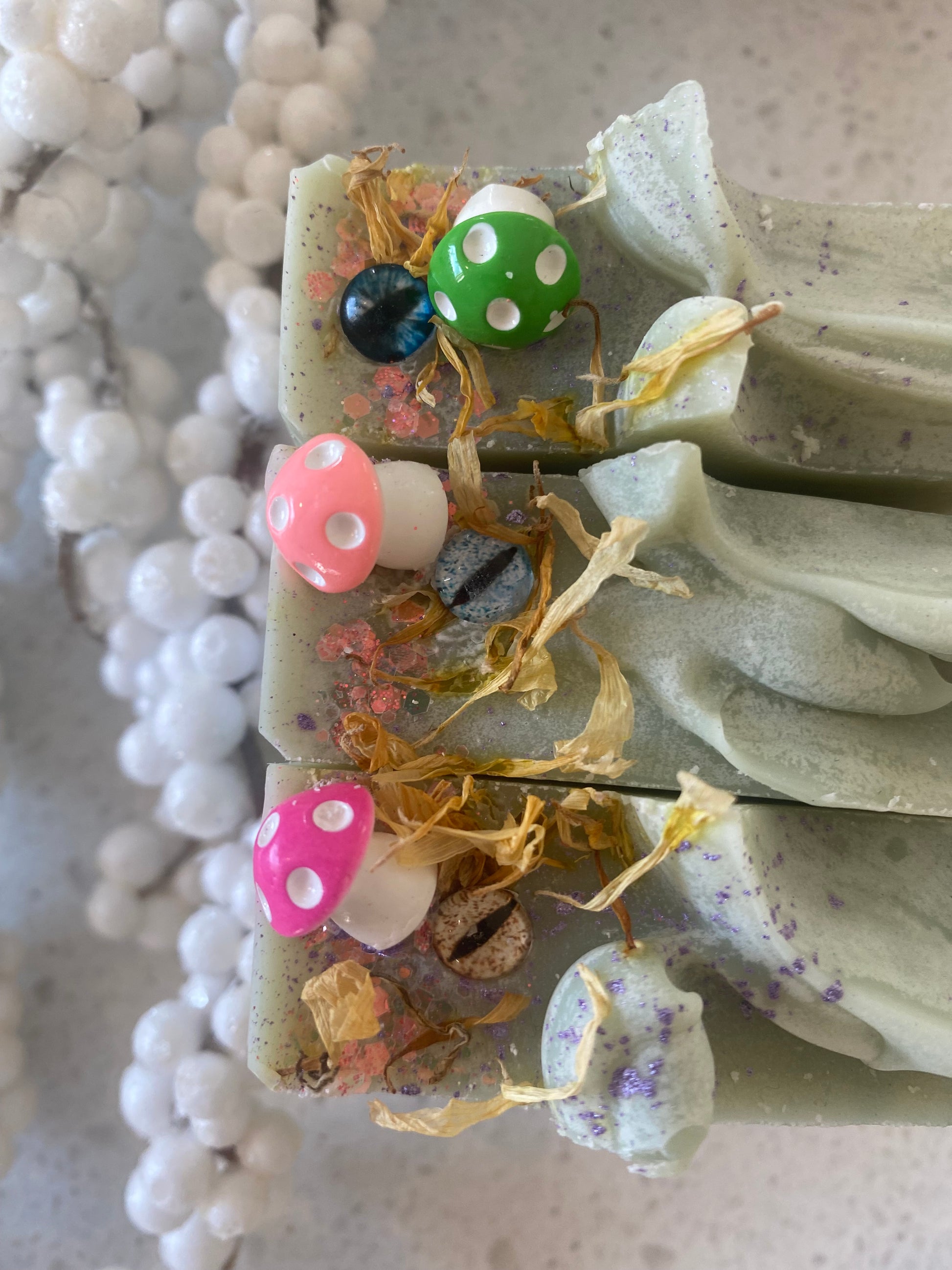 Your Alice in Wonderland Themed soap is adorned with a Cheshire Cat Eye, and Mushroom Toad Stool seat fit for a mini tea party.