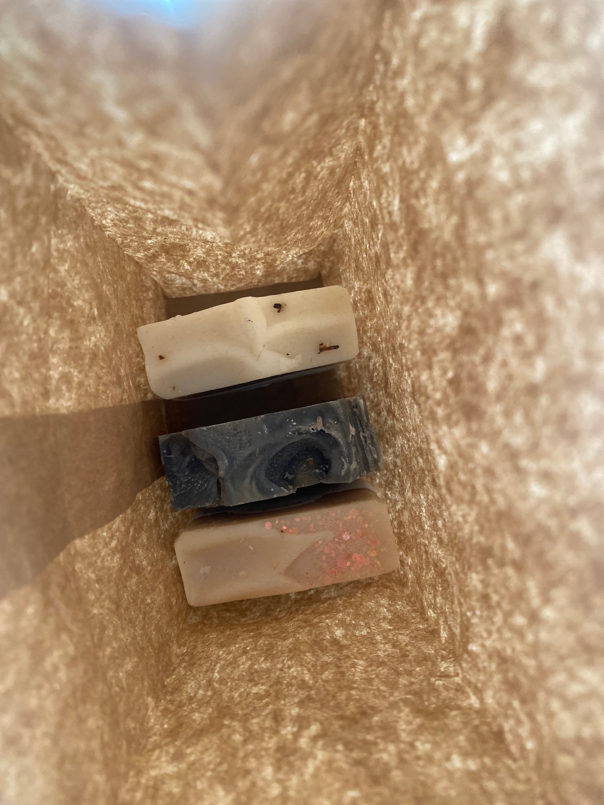 You'll get a mystery paper sack of 3 soaps, that have either been cut imperfectly, lost some of their scent, or are out of season.
